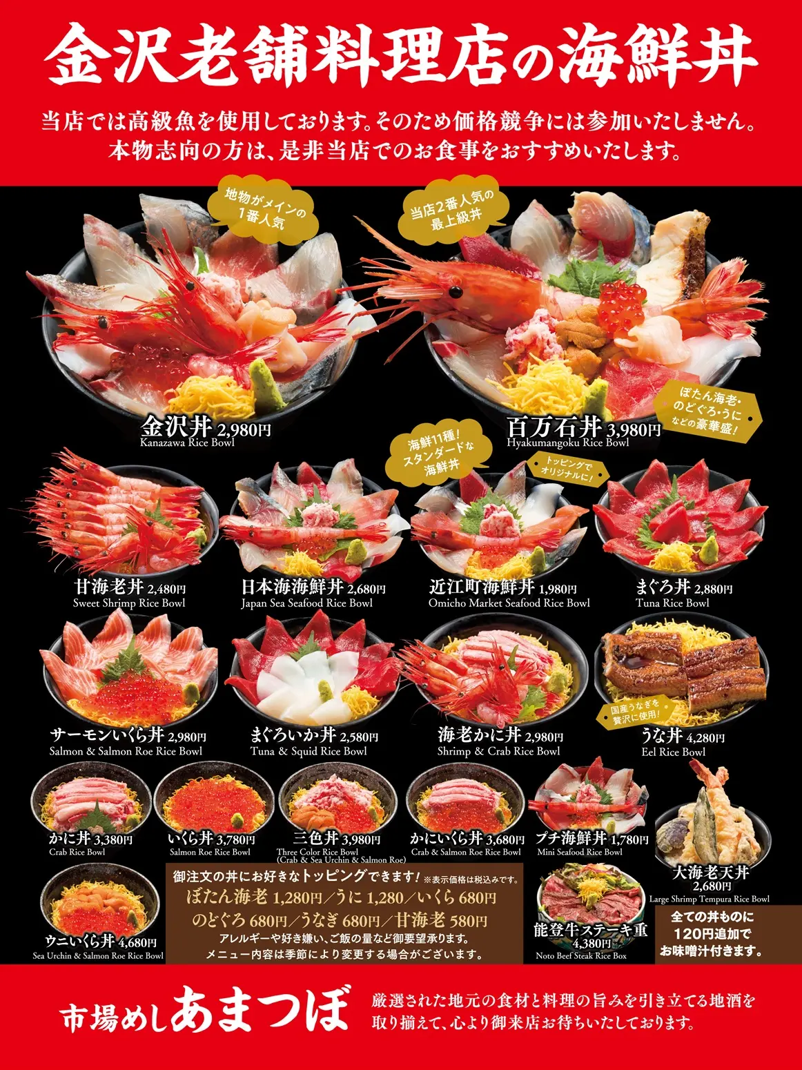 金沢丼 百万石丼 サーモンイクラ丼 近江町海鮮丼 プチ海鮮丼 日本海鮮丼 海老カニ丼 甘海老丼 マグロ丼 マグロイカ丼 三色丼 雲丹イクラ丼 イクラ丼 カニイクラ丼 カニ丼 能登牛ステーキ丼 ウナギ丼 大海老天丼